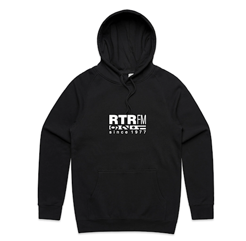 Featuring the old RTRFM logo on a AS Colour Stencil Hoodie in Black with a white logo.